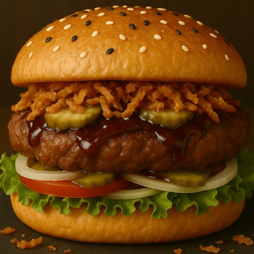 mit Sauergurken, Röstzwiebeln und White-Barbecuesauce